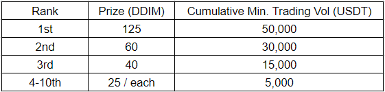 Users who trade DDIM during the activity period will be ranked based on their trading volume. The top 10 users with the largest trading volume (meeting min. trading volume requirement of 5,000 USDT) can share a 400 DDIM prize pool in proportion to their trading volume respectively.